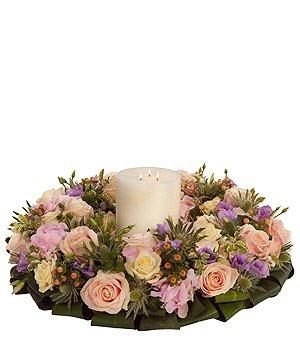 A triple wick church candle encompassed by a pretty pastel wreath. Pink and cream Roses, pink Hydrangea and Hypericum are mixed with purple Lisianthus and white Eryngium.