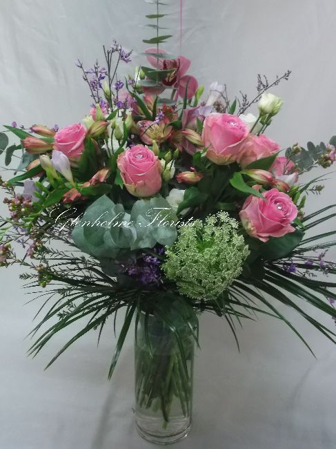 A very pretty selection of flowers in pink and pastel shades including stunning roses. Beautifully arranged into a vase, making the perfect gift. Exact content may very to image due to seasonal availability but the design will always include roses.